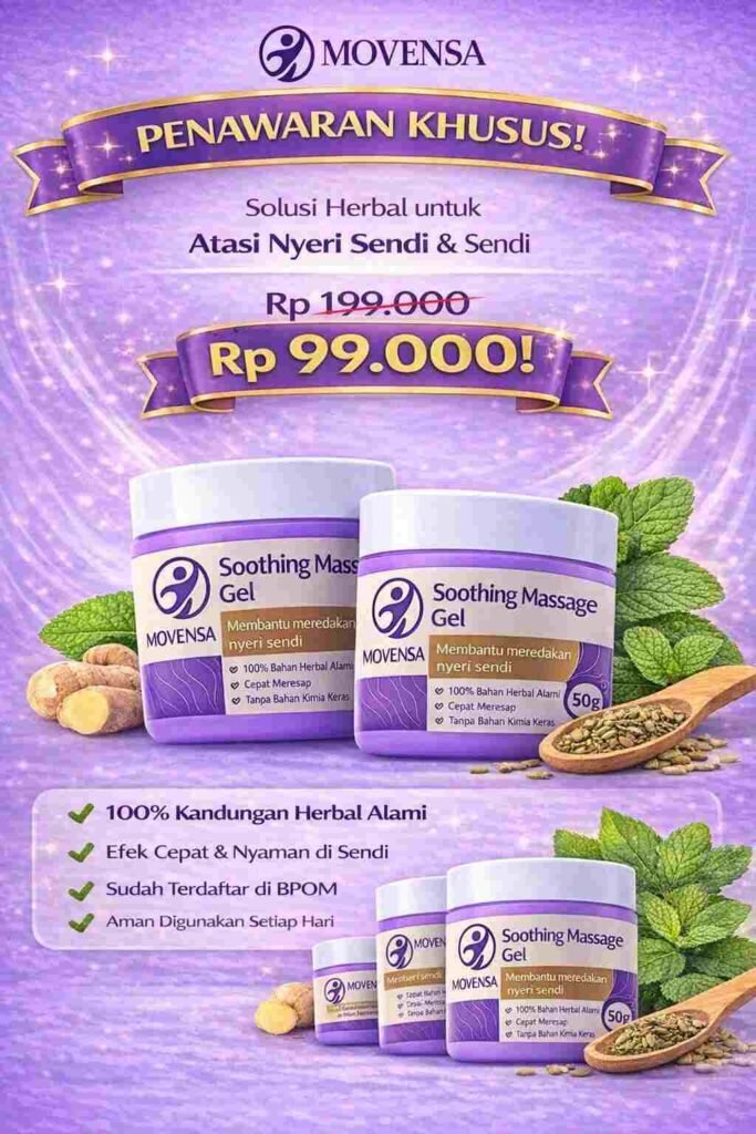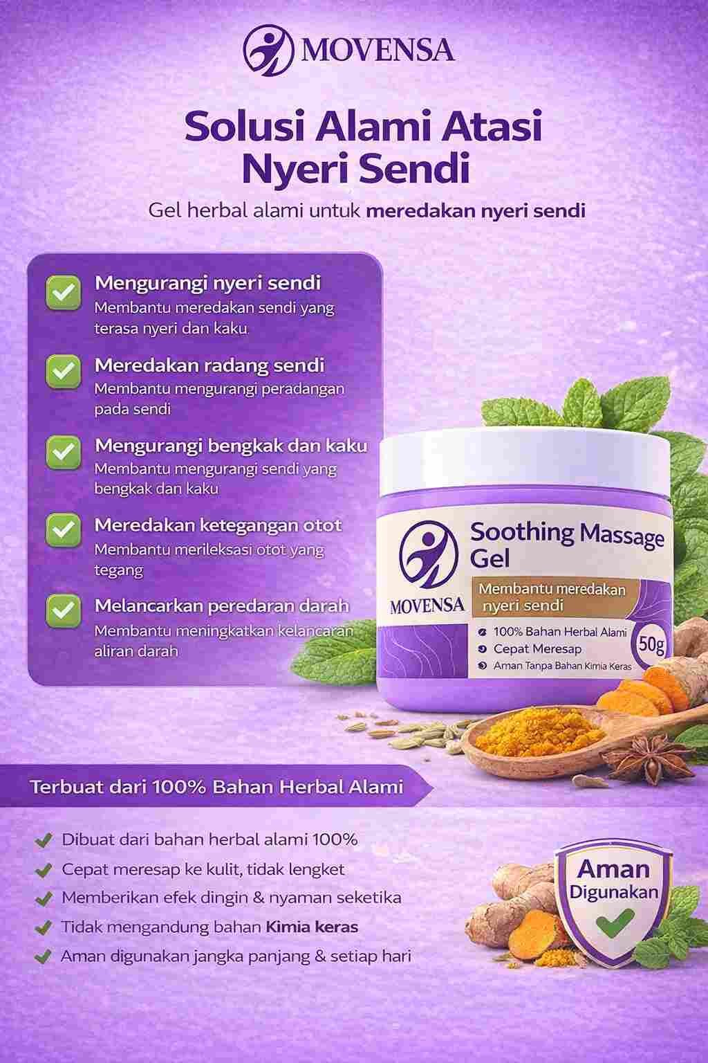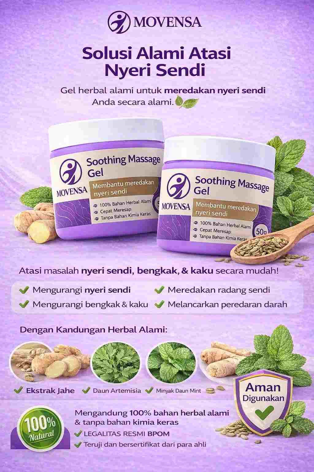 Movensa Soothing Gel hadir sebagai solusi alami untuk membantu mengatasi berbagai masalah sendi. Dengan kandungan herbal pilihan, membantu meredakan pegal, kaku, hingga rasa tidak nyaman pada sendi. Praktis digunakan, cepat menyerap, dan aman untuk pemakaian sehari-hari.